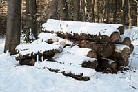 Koud winterlandschap, winterbeeld, wintersfeer in de bossen van Lage Vuursche. Houtstapel, boomstammen, houtvoorraad, gekapte bomen bedekt met verse sneeuw. Natuurlandschap, winterbos. Na een boswandeling kun je in dit dorp warme chocolademelk drinken bij een knapperend haardvuur.