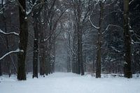 Dit is een boslaan in het Spanderswoud in Hilversum tijdens een sneeuwbui in de winter van 2021. De sneeuw geeft een erg mooi en fotogeniek effect op de grote oude bomen