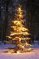 Besneeuwde denneboom in de bossen in Nederland bij avond