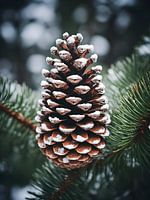 Een met sneeuw bedekte dennenappel straalt een stille, natuurlijke schoonheid uit die diep verbonden is met de magie van de winter. De dennenappel is bedekt met een laagje verse sneeuw en ziet eruit alsof hij is bestrooid met poedersuiker - elk detail van zijn schaalachtige structuur wordt benadrukt, elke kromming zachtjes geaccentueerd. De koude kristallen vormen fijne lijnen en geven het geheel een bijna sprookjesachtige glans.