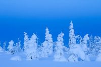 Besneeuwde bomen in taiga bos in Lapland (Finland) in de vroege ochtend. Gehuld in blauwe gloed.