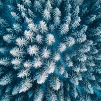 Een winterse wolkenzee van kristalheldere dennenbomen strekt zich majestueus uit in de kou. IJzige, glinsterende landschapsklokken wekken de indruk van een mysterieuze boswereld, waar elke boom een levend kunstwerk lijkt. De zachte, besneeuwde toppen verlenen het landschap een kalme elegantie, terwijl het koele kleurenpalet een harmonieuze stilte uitstraalt.