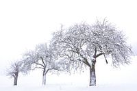 In de winter staan drie fruitbomen op de sneeuw, tegen een witte achtergrond, kaal en knoestig.