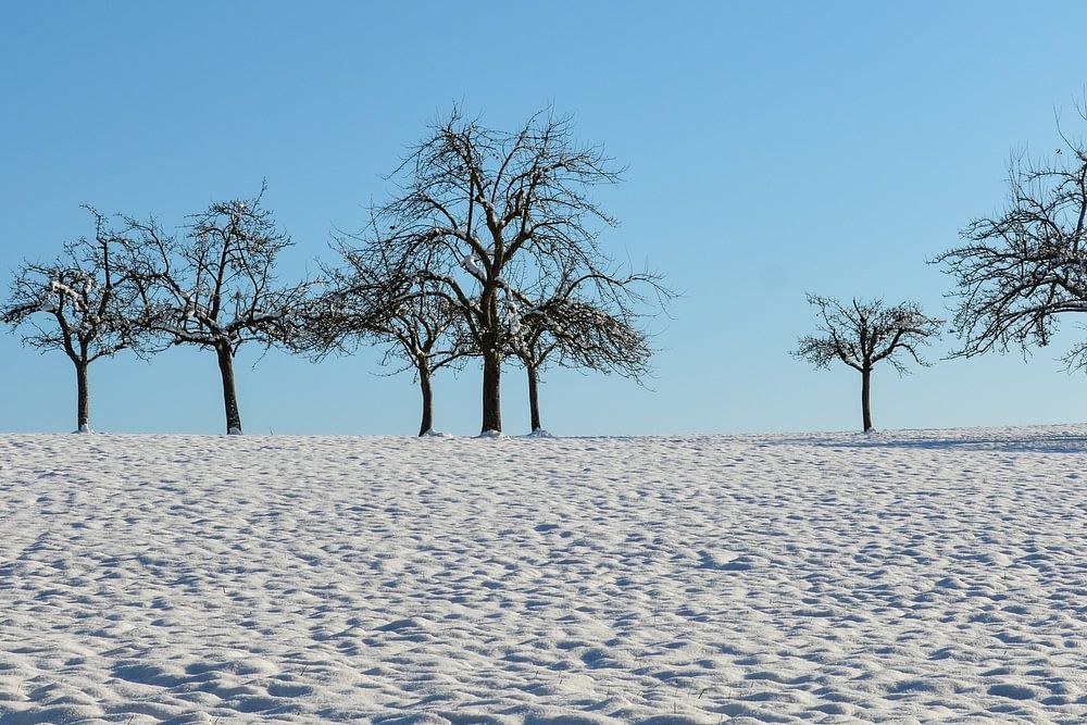 Besneeuwde natuur - Veel sneeuw met wat bomen en blauwe lucht