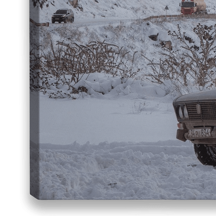 Oude auto's uit de Sovjetunie trotseren de besneeuwde bergen van de Kaukasus in Armenie