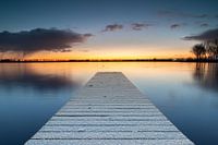 Het laagje sneeuw, dat tijdens de kouden nacht is gevallen, is op de steiger blijven liggen. Aan de horizon is een sneeuwbui te zien, evenals de rij bomen naast het meer. Samen met de kleuren van de opkomende zon en het stille water ontstaat een heerlijk winters plaatje.