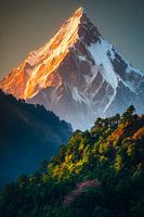 De besneeuwde top rijst majestueus op in de lucht, gehuld in warm licht. Eronder strekt zich een weelderig bos uit, dat de ongerepte schoonheid van de natuur belichaamt. Dit indrukwekkende motief brengt frisheid en inspiratie in elke woonkamer en nodigt uit tot dromen. Ideaal voor reizigers die het avontuur in hun huis willen voelen.
