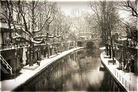 De kades en werven van de Oudegracht in Utrecht, met sneeuw bedekt. In de lente, zomer en herfst zitten deze werven vol met horecaterassen en bezoekers, en maakt de Utrechtse binnenstad daardoor uitermate sfeervol. Het winkelend publiek en klein verkeer bevindt zich boven aan het trottoir, de horeca zit dan aan het water waar alleen…