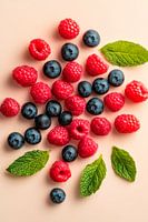 Een frisse variëteit van sappige frambozen en verleidelijke bosbessen, omlijst door aromatische muntblaadjes. De levendige kleuren en fruitige texturen geven elke kamer een gevoel van levensvreugde. Perfect voor de keuken of eetkamer om een uitnodigende sfeer te creëren en de eetlust op te wekken.