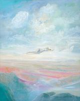 In dit betoverende schilderij is een zwevende vrouwenfiguur afgebeeld in een lichte en luchtige compositie vol delicate turquoise en roze tinten. Het zachte kleurenpalet geeft het schilderij een droomachtige sfeer waarin de figuur gewichtloos lijkt te zweven.