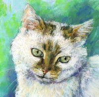 Dit is een detail in liggend formaat van mijn pastelschilderij Dear Friend met de nadruk op het gezicht en de prachtige groene ogen van de kat.