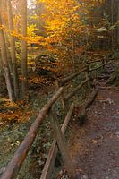 De houten leuning fungeert als sterke leidende lijn en trekt het oog het beeld in, richting de diepte van het bos. Het pad, met zijn natuurlijke textuur van modder en…