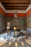 De compositie is frontaal georiënteerd en laat een duidelijke structuur zien tussen het wandontwerp, het meubilair en de diepte van de kamer. Deze afbeelding is geschikt voor thema's als interieurontwerp, historische kamers, tegelkunst, paleisarchitectuur, Mudejar-stijl, Andalusië, Spanje, decoratie en cultuurgeschiedenis. Het is veelzijdig en kan worden gebruikt in digitale media, tentoonstellingen of als decoratief element in woon- en werkruimten.
