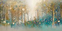 Dit abstracte schilderij vangt een betoverd bos in een dromerige compositie. Verticale lijnen suggereren bomen, terwijl talloze cirkels een magische sfeer creëren als lichtreflecties of zwevende bellen. Warme gouden tinten contrasteren met koele blauwen en groenen, wat diepte en mysterie toevoegt. Het lichtere centrum suggereert een open plek of bospad. Het werk roept verwondering en sereniteit op, en nodigt uit tot onderdompeling in een wereld waar natuur en fantasie samensmelten. De stijl mengt impressionisme en abstractie, creërend een contemplatieve ruimte in een sprookjesachtig landschap.