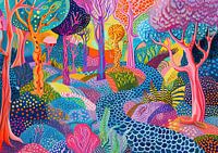 Betoverd Bos - Dit kleurrijke schilderij onthult een betoverend bos met psychedelische, gedetailleerd geschakeerde bomen en een veelheid aan fantasierijke planten, uitgevoerd in een levendige, abstracte stijl die de kijker meeneemt naar een andere wereld.