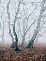 Mystiek betoverd bos in de januari mist