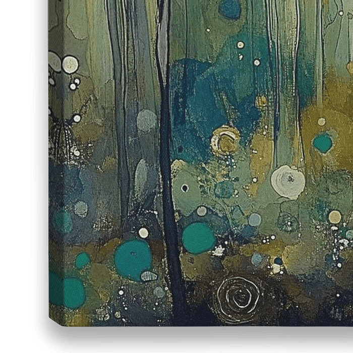 Dit schilderij vangt de essentie van een betoverd bos in een abstracte, dromerige stijl. Verticale lijnen suggereren boomstammen, terwijl kleurrijke cirkels en druppels een magische sfeer creëren, als lichtreflecties of boswezens. De warme gouden tinten contrasteren met koele groenen en blauwen, wat diepte en mysterie toevoegt. De…
