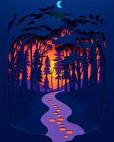 Het kunstwerk draait om een kronkelend pad, weergegeven in levendig paars, dat zich een weg baant door een dichtbegroeid bos. Torenhoge bomen, afgebeeld in diepe…