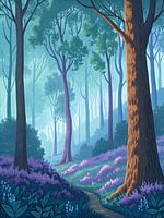 Een abstracte illustratie van een serene bosscène met hoge bomen, een kronkelend pad en levendige paarse bloemen. Het kunstwerk combineert realistische elementen met een vleugje fantasie, waardoor een magische en uitnodigende sfeer ontstaat.