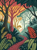 Een levendige en gestileerde illustratie met een grillig boslandschap. Een kronkelend roodachtig pad leidt de kijker door een dichte waaier van kleurrijke bomen en weelderig, oversized gebladerte. Het kleurenpalet is rijk en gevarieerd, met diepgroene, rode en oranje tinten en een vleugje lichtblauw en geel, wat een fantastische en uitnodigende sfeer creëert. De tekenstijl is gedurfd en grafisch, met de nadruk op vormen en texturen in plaats van realistische details.