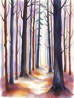 Stap in de serene schoonheid van het "Enchanted Forest Pathway," een betoverend aquarel landschap dat je uitnodigt voor een rustige reis. Dit suggestieve kunstwerk bestaat uit een verzameling torenhoge bomen waarvan de slanke stammen zijn geschilderd in een harmonieus palet van warm bruin, diep paars en subtiel grijs. Een…