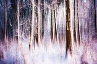 Besneeuwd winterbos gefotografeerd met een speciale fotografische techniek. Hierdoor ziet de foto er betoverend uit.