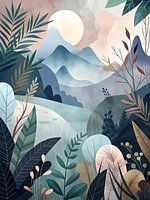 Dit betoverende kunstwerk verbeeldt een grillige vallei vol weelderig gebladerte en glooiende heuvels. De kunstenaar's gebruik van zachte kleuren en ingewikkelde details creëert een magische en uitnodigende scène. Dit stuk is perfect om een vleugje fantasie en verwondering toe te voegen aan elke ruimte.