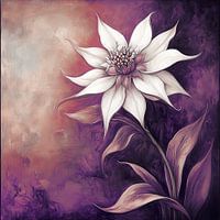 Een grote, witte bloem met puntige bloemblaadjes steekt af tegen een rijke, paarsgetinte achtergrond. Het kleurverloop benadrukt de complexe details van de bloemblaadjes en bladeren.