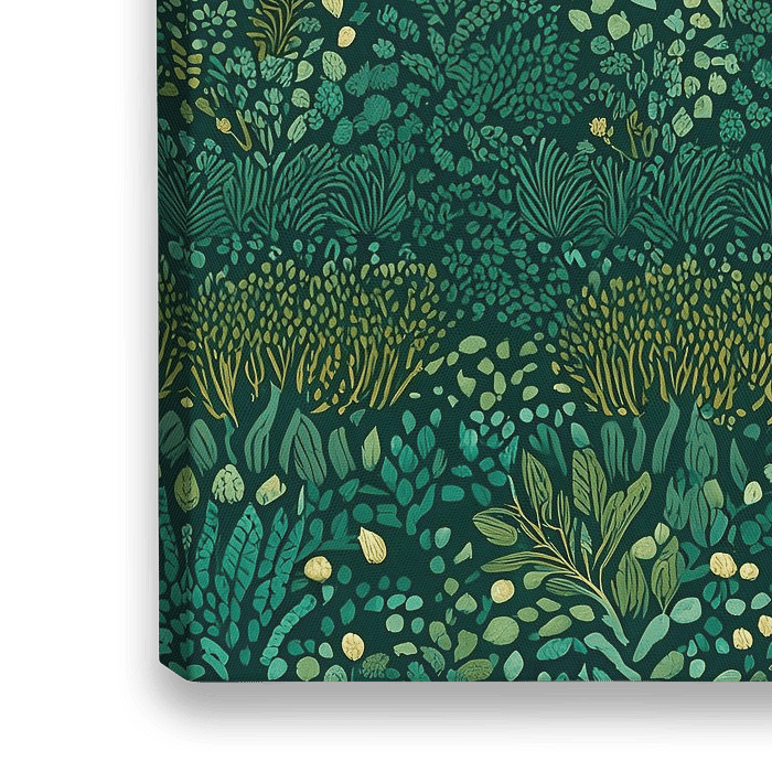 Dit ontwerp weerspiegelt de weelderige levendigheid van een dichte, gestileerde weide. Het bevat een rijk tapijt van botanische elementen, met de nadruk op gelaagdheid en ingewikkelde details. Het kleurenpalet concentreert zich rond diepe groentinten en creëert een gevoel van diepte en rust.