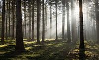 Stap in de serene schoonheid van een diep bos, waar de ochtendzon door de hoge, slanke dennenbomen schijnt. Deze foto legt een magisch spel van licht en schaduw vast, terwijl zonnestralen zacht door de bomen breken en het tapijt van groen mos op de bosbodem verlichten. De harmonie tussen het licht en de natuurlijke structuren creëert een rustgevende en bijna spirituele sfeer.