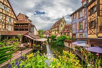 Ervaar de tijdloze charme van Colmar in de Elzas, Frankrijk, met deze prachtige foto. Laat je betoveren door de sprookjesachtige vakwerkhuizen, de kleurrijke bloemenpracht en de idyllische grachten die Colmar tot een van de meest pittoreske plekjes van Frankrijk maken.
