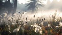 Deze close-up afbeelding toont een betoverend tafereel van katoengras in een veld tijdens de vroege ochtend, waarbij de dampen van de nacht nog zichtbaar zijn. De ochtendzon werpt haar zachte gloed over het landschap en creëert een serene sfeer. Het katoengras, omgeven door mistige nevels, lijkt bijna te zweven in de lucht. De fijne…