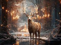 Deze betoverende foto vangt de geest van Kerstmis met een majestueus hert dat in een besneeuwde kerstomgeving staat, omringd door groene en oranje tinten. Dit kunstwerk past perfect in een kerstachtig, gezellig interieur en brengt de warmte en vreugde van de feestdagen in huis. De groene en oranje tinten voegen een vleugje kerstsfeer…