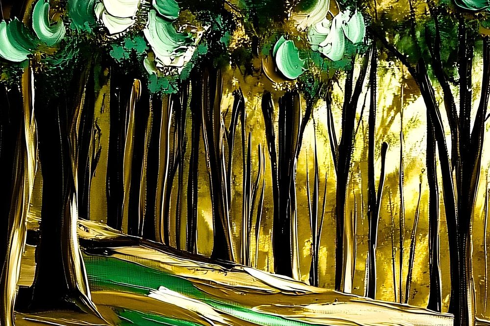 Laat je meenemen in de magie van dit schilderij waarin het zonlicht speels door de bomen schijnt. De diepe groentinten gecombineerd met gouden accenten creëren een rustgevende en warme sfeer. Dit ontwerp is perfect om een ruimte tot leven te brengen en een natuurlijke uitstraling te geven. Of je het nu in de woonkamer, hal of kantoor plaatst, het voegt een vleugje elegantie toe en trekt direct de aandacht. Dit schilderij roept het gevoel op van een rustige wandeling in een betoverend bos, waar natuur en kunst perfect samenkomen. Een prachtige keuze voor wanddecoratie!