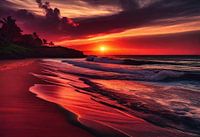 "Enchanted Twilight Red" is een betoverende muurschildering die de schoonheid van een avondstrand vastlegt, in een intens rode kleur die de sfeer doordrenkt met passie en warmte. Het kunstwerk toont een uitgestrekt strand dat zich uitstrekt langs de kust van een kalme oceaan. Het silhouet van palmbomen steekt majestueus af tegen de…