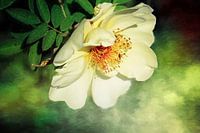 Een delicate witte bloem steekt af tegen een vage groene achtergrond. De opvallende meeldraden voegen een vleugje levendige kleur toe aan de compositie.