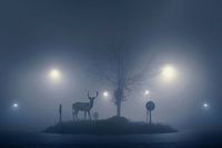Betoverende Avondfoto: Mystieke Ree op een Mistige Rotonde voor Uw Interieur van Elianne van Turennout