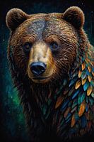 Dit majestueuze stuk moderne kunst brengt de essentie van de natuur en dierlijk koningschap tot leven met een levendig kleurenpalet en een suggestieve nachtelijke ambiance. Het verbeeldt een statige beer, gevangen in een moment van stille observatie, omgeven door een dromerige achtergrond van sterren en kosmische nevels. De uitgestrekte penseelstreken en rijke textuur geven dit kunstwerk een bijna tastbare kwaliteit, terwijl de speling van licht en schaduw de diepte van het beeld verder benadrukt. Of het nu een opvallend middelpunt in een woonkamer is of een inspirerend kunstwerk in een kantoor, deze representatie van een beer in de wildernis van de nacht spreekt tot de verbeelding en roept een gevoel van verwondering en respect voor de natuurlijke wereld op.