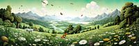 Dit prachtige schilderij neemt je mee naar een betoverende natuuromgeving in de bergen, waar fantasievlinders dansen tussen de bloemen en de adembenemende schoonheid van de omgeving versterken.