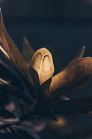 Deze afbeelding toont een plant met verschillende bladeren waar zonlicht doorheen schijnt. Een donkere achtergrond creëert een contrastrijk beeld, waarbij de bladnerven duidelijk zichtbaar zijn. De bladeren hebben een lichtgele tint, waardoor ze een zachte en warme uitstraling hebben. Het zonlicht dat door de bladeren valt, creëert een prachtig spel van licht en schaduw, waardoor de complexiteit van de bladstructuur wordt benadrukt. Het geheel geeft een gevoel van natuurlijke sereniteit en brengt de schoonheid van de plant tot leven.