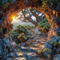 De “Betoverde Doorgang”, een meesterwerk dat de magie van de natuurlijke wereld vastlegt. Dit kunstwerk, toont een mystiek pad dat zich een weg baant door een betoverd bos, verlicht door de gouden stralen van de ondergaande zon.