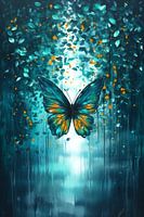 Deze afbeelding vangt een sprookjesachtige scène waarin een turquoise en oranje vlinder het middelpunt vormt. Achter deze betoverende vlinder fladderen talloze bloemblaadjes als lenteregen naar beneden dwarrelen.