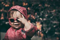 Ontdek de magie van dit betoverende tafereel van een 9 maanden oud meisje, gekleed in een schattige roze jas, perfect passend bij het zachte herfstlicht. Ze draagt een roze zonnebril die haar kleine gezichtje omlijst en haar een charmante, speelse uitstraling geeft. De achtergrond vervaagt in een prachtige bokeh, met de scherpte volledig gericht op haar vrolijke verschijning.