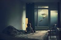 Ontdek een adembenemende fotomanipulatie waarin een baby gefascineerd uit het raam kijkt, terwijl zijn aandacht wordt getrokken door speelse dolfijnen in een denkbeeldig aquarium. Deze magische scène combineert de onschuldige verwondering van een kind met de schoonheid van de onderwaterwereld, perfect voor unieke…