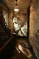 Trefwoorden: wandkunst, vintage interieur, bohemien stijl, artistieke hal, schaduwportret, eclectisch design, industriële woonstijl, houten vloer, kroonluchter, creatieve muurdecoratie
