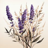 De paarse bloemen stralen een tijdloze charme uit, en staan centraal op een rustgevende beige achtergrond. Met kunstzinnige penseelstreken en verfijnde kleuren vangt het kunstwerk de essentie van de lavendelbloemen en creëert het een sfeer van rust en elegantie. De vintage gloed voegt een vleugje nostalgie toe en neemt de kijker mee naar een sprookjesachtige bloementuin van weleer.