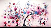 Centraal staat een boom die lijkt te leven, vol met kleurrijke, draaiende bloemen en cirkelvormige patronen die zich uitstrekken als takken en wortels. De kleuren zijn zacht en toch levendig, met tinten roze, blauw, oranje, en zwart die samen een harmonieus geheel vormen. Figuren die lijken op speelse, gestileerde personages en dieren voegen een laag van verhalen en mysterie toe. De lucht rond de boom is gevuld met zwevende elementen, waardoor het tafereel dynamisch en levendig aanvoelt. Het geheel doet denken aan een dans waarbij de natuur en de levende elementen in een perfecte balans zijn.