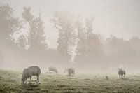 De mist zorgt voor een zachte, diffuus verlichte omgeving waarin de contouren van de schapen vaag zichtbaar zijn. Dit draagt bij aan de dromerige atmosfeer en versterkt het gevoel van betovering dat dit beeld oproept. Het contrast tussen het rustieke tafereel van de schapen in de wei en de etherische kwaliteit van de mist creëert een boeiend visueel contrast dat de aandacht van de kijker trekt.