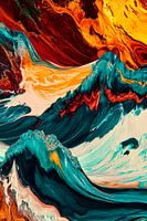Hier ontvouwt zich een fascinerend kleurenspel, met levendige blauwtinten die krachtig botsen met helder rood. Deze dynamische compositie doet denken aan machtige golven en creëert een warme, energieke flair. Ideaal voor de woonkamer, brengt beweging en leven in elke kamer en stimuleert de verbeelding.