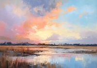 Landschap met betoverende kleuren. Complementaire kleuren die prachtig in elkaar overlopen en bij elkaar staan. Een landschap van water, riet, grond, lucht en wolken met zondoorschijning. Pasteltinten in blauw, zalm, roze, lila, paars, bruin, zwart en wit. Passend bij diverse stijlen en trends.